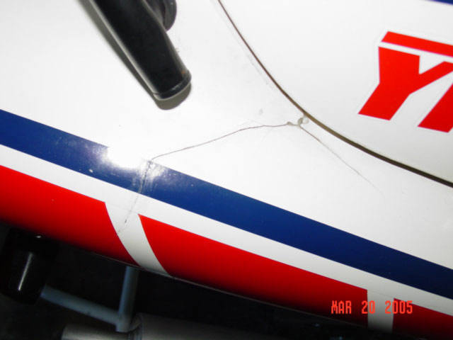 FLAWS: Cracked side panel on the right tail section. Not too noticable...the previous owner cracked it while serv-